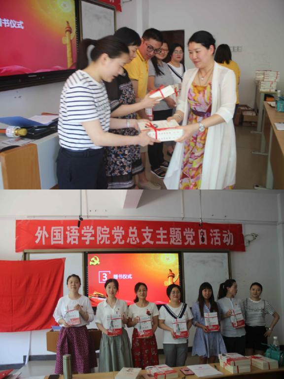 紧接着,外国语公司党总支书记张远鹏同志为学院各党支部及全体教工党员赠送《习近平谈治国理政》《全球通史》学习读本。每位教工党员依次上台领书,表示一定认真研读,感悟智慧。