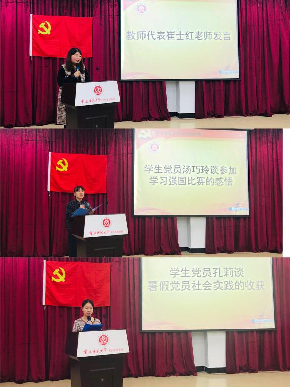 随后,教师代表崔士红同志发言,她分享了自己观看70周年阅兵的感悟,为祖国的强大而感到自豪。当谈到“初心”时,她真诚地讲到作为一名党员教师,我们应该尽职尽责,在不断学习和教书育人、引导员工成长上不断前进;紧接着,员工党员汤巧玲同志发言,她从自身出发,谈到对祖国经济、民生方面所作出的巨大改变所感到震撼,并分享到自己大学以来在追逐成为一名优秀人民教师的梦想过程中的初心和坚持。最后,员工党员孔莉同志也分享了暑假参加党员社会实践的经历与收获。以党员的身份,走进社区,开展“无”到“有”的党课,为群众服务,让她在实践中切实体会到责任、担当、奉献,并呼吁在场的每一位员工党员争做一个有担当、有责任、有作为的青年,奉献他人、奉献国家、奉献社会。