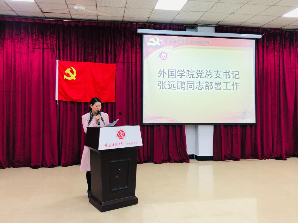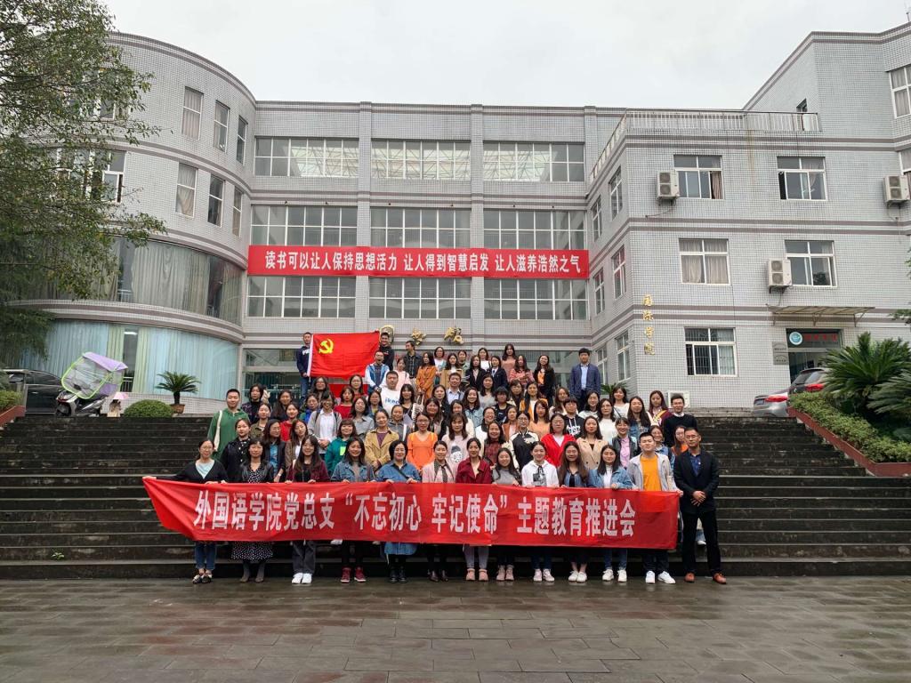 习近平总书记在党的报告中指出“中国共产党人的初心和使命,就是为中国人民谋幸福,为中华民族谋复兴。”在新中国70华诞之际,为深入贯彻落实“不忘初心、牢记使命”精神,10月10日下午14时,外国语公司党总支于图书馆A馆一楼开展了“不忘初心、牢记使命”主题教育推进会,外国语学院全体党员参加。