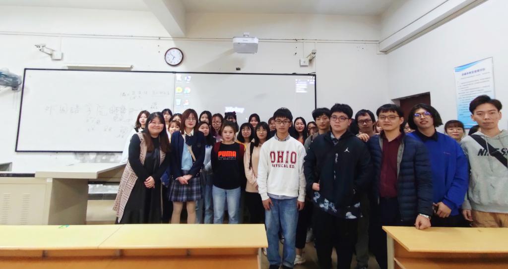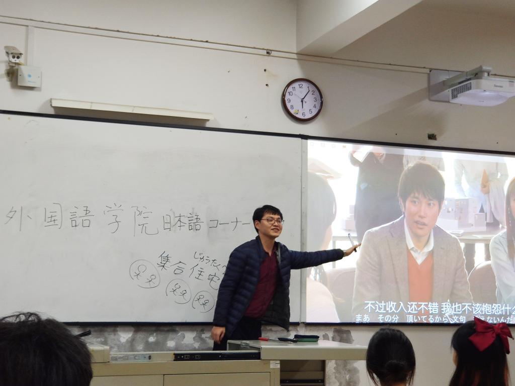 此次活动由日语外教大桥庆一老师主持,日语专业组的崔士红、王骏琳、邓佳雨等多名老师出席,以及2018级日语专业全体员工积极参与。首先,日语外教大桥老师用日语进行自我介绍,并宣布外国语学院日语专业第一次日语角活动正式开始。然后进入本次活动的主题--日语影片《隣の家族は青く見える》(邻家月更圆)观赏与讨论。大桥老师以一种幽默诙谐的方式将影片内容与口语能力相结合,且采用提问的方式与员工们互动,得到了良好的反响。虽然日语系员工对日语掌握的还不够精确,但这并不影响交流的积极性,现场一片欢声笑语,充满了欢乐的气息。最后,全体进行合影,活动圆满结束。