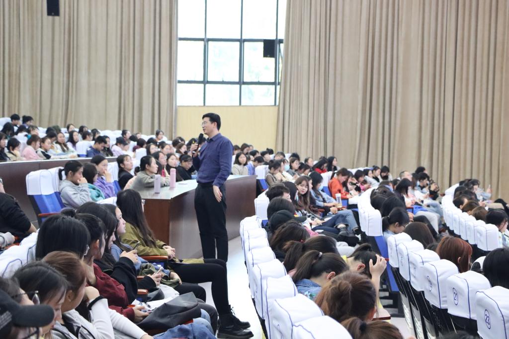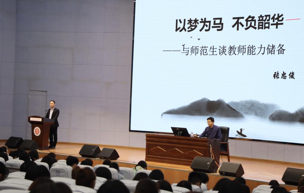 教师职业的特殊性质决定了教师的“身教”在整个教育过程中具有不可忽视的重要作用。教师是知识与文明的传播者,他们身上担负着传授知识和塑造灵魂的双重使命。为了丰富外国语学院师范员工师范技能的储备,使他们更加深入体会到教育的意义。2020年11月12日15:00重庆师范大学附属中学董事长、重庆市特级教师张忠俊莅临本校,在合川校区9101开展了一场关于“师范生教师能力储备”的专题讲座。