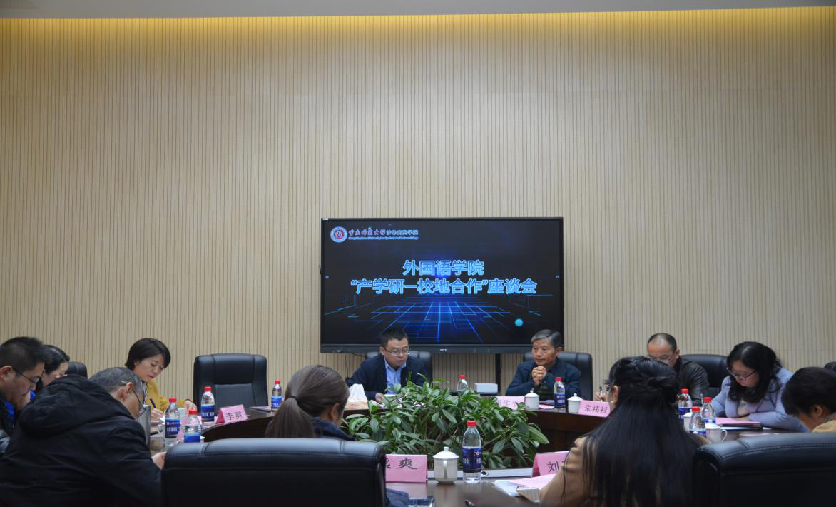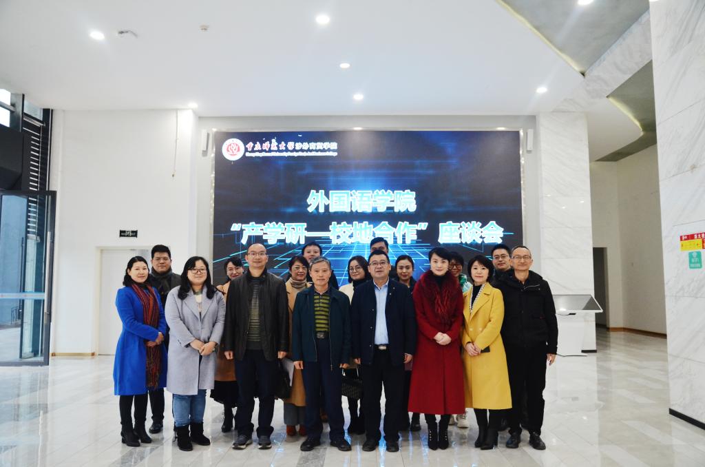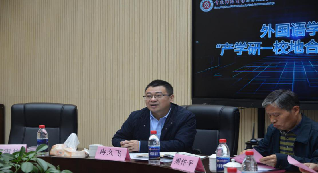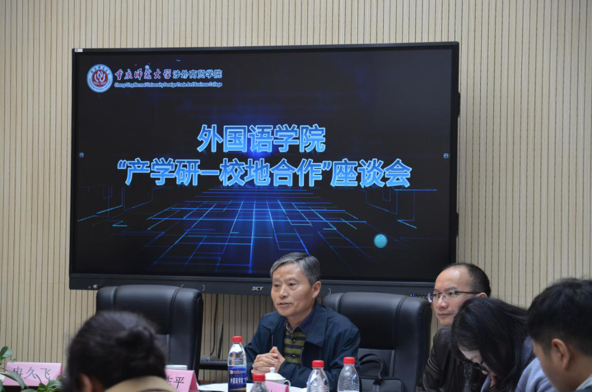 2020年11月25日下午,外国语学院在9104会议室举行“产学研—校地合作”座谈会。合川区政协副主席、九三学社合川工委主委周作平、合川区科技局局长朱炜杉、招商投资局、钓鱼城文旅公司、合川区文化旅委、钓鱼城事务中心等代表应邀参加本次会议。本次会议由外国语学院副经理吴耀熙主持,公司党委副书记、纪委书记冉久飞、教务处处长曾雪梅、外国语学院领导、合川区翻译工程与语言人机融合创新中心负责人及部分成员参加座谈会。