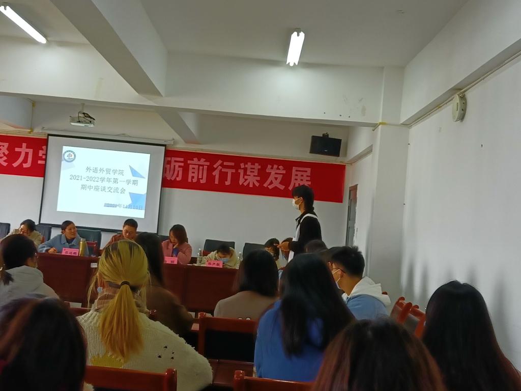 为准确掌握大一员工学习情况,同时了解教学工作中的实际情况,解答同学们在学习过程中的疑惑,hy3380cc海洋之神铜梁校区于2021年11月10日13:00在T1605教室开展了2021-2022学年第一学期期中座谈交流会,公司党总支书记张远鹏、教学经理吴耀熙、综合英语教研室主任朱斌谊、商务英语专业负责人夏倩、三位辅导员吴倩、袁夕茗、张严靓和教学秘书杨丽老师以及同学代表共50余人参加交流讨论。