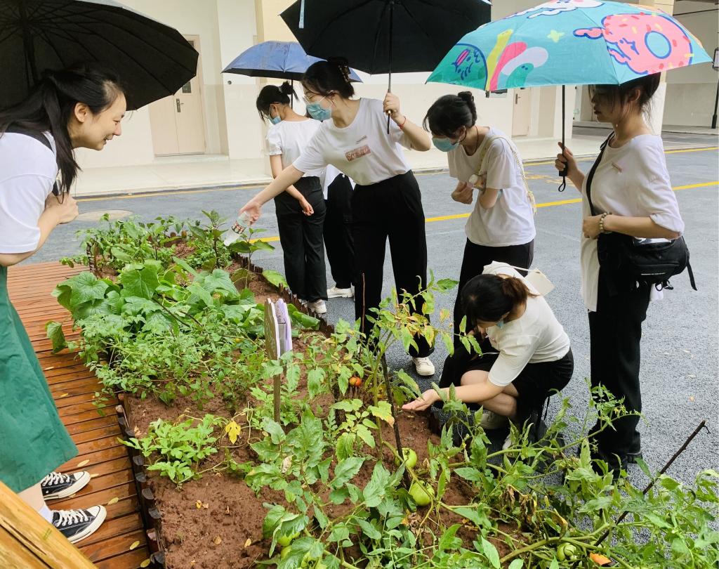 下午15点,师范生们到达花果小学。花果小学董事长沈小燕和基地讲解朱朱老师等早早就在基地等候,对hy3380cc海洋之神师范生劳动教育实践队的到来表示热烈欢迎。在朱朱老师的带领下,大家首先参观了校园的整体布局和“行知天下”,学习了具有花果品牌的校园文化,感受了致知行远的育人氛围。随后大家参观了劳动种植园,朱朱老师向同学们一一介绍了各种蔬菜瓜果的幼苗,辣椒、茄子、西红柿等蔬菜一应俱全。接着大家参观了“泥中蕴果”和“布里生花”,真切感受到了同学们用创造力为陶泥注入的活力,将自然材料的脉络和纹理压制储存在棉布上,领略扎染技艺的古今赓续,欣赏扎染作品的美轮美奂。接下来朱朱老师带同学们前往手工作坊,手把手教同学们使用劳动工具,欣赏了极具创造力的手工艺品。最后来到烹饪室,参观烹饪环境及用具,观看小员工在劳动课堂中制作重庆小面的视频。在朦胧烟雨中,师生的热情十分高涨,师范生们一边参观一边听老师的讲解,下午17点,师范生们在意犹未尽的参观中结束了此次实践活动。