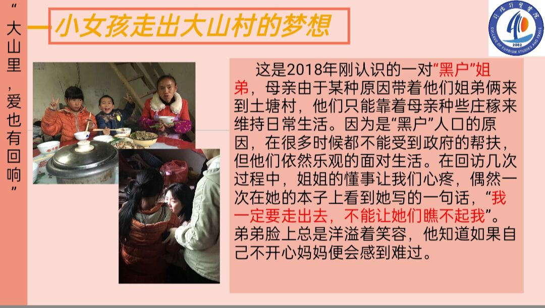 活动中邀优秀志愿者文建欣同学分享自己的志愿者经历。文建欣同学来自于2021级应用英语1班,她秉持志愿初心,不断做着自己力所能及的一些事情,以行动诠释自己,至今已累积1248个工时。文建欣同学在讲述自己志愿工作经历时,一对“黑户”姐弟给她留下了深刻印象:他们自幼家庭生活清贫,唯一收入来源靠母亲辛苦劳作,又无法收到社会帮助,但是他们仍然以积极乐观的态度面对生活,诠释了大山里的爱也有回响。分享结束后,文建新同学回答了同学们对志愿活动的疑问,以自己的切身经验和感想来诠释志愿者的意义。活动最后,袁夕茗老师对本次活动寄予希望,并鼓励同学们积极参与到志愿活动之中。