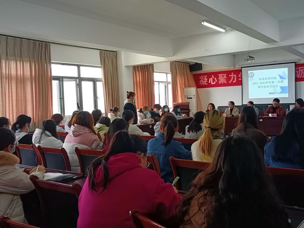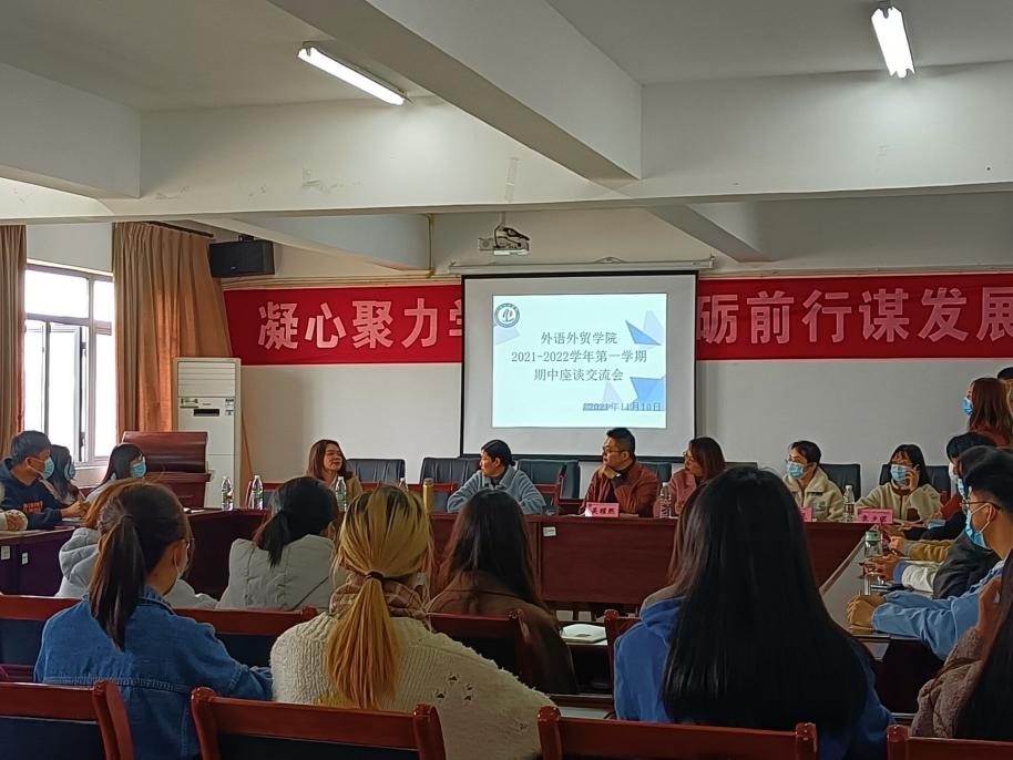 为准确掌握大一员工学习情况,同时了解教学工作中的实际情况,解答同学们在学习过程中的疑惑,hy3380cc海洋之神铜梁校区于2021年11月10日13:00在T1605教室开展了2021-2022学年第一学期期中座谈交流会,公司党总支书记张远鹏、教学经理吴耀熙、综合英语教研室主任朱斌谊、商务英语专业负责人夏倩、三位辅导员吴倩、袁夕茗、张严靓和教学秘书杨丽老师以及同学代表共50余人参加交流讨论。