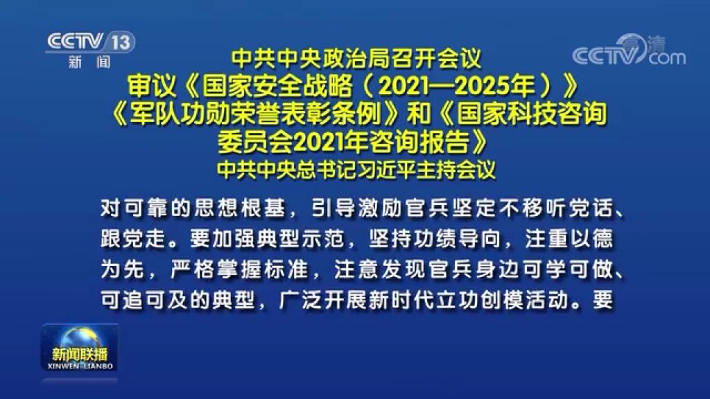 2.新华社北京11月18日电中共中央政治局11月18日召开会议,审议《国家安全战略(2021-2025年)》.《军队功勋荣誉表彰条例》和《国家科技咨询委员会2021年咨询报告》。中共中央总书记习近平主持会议。