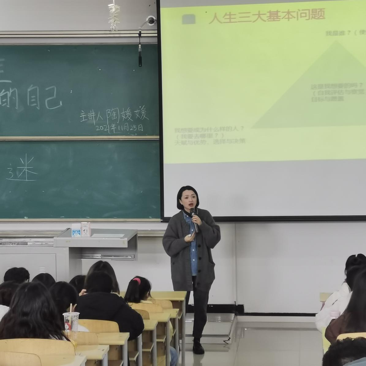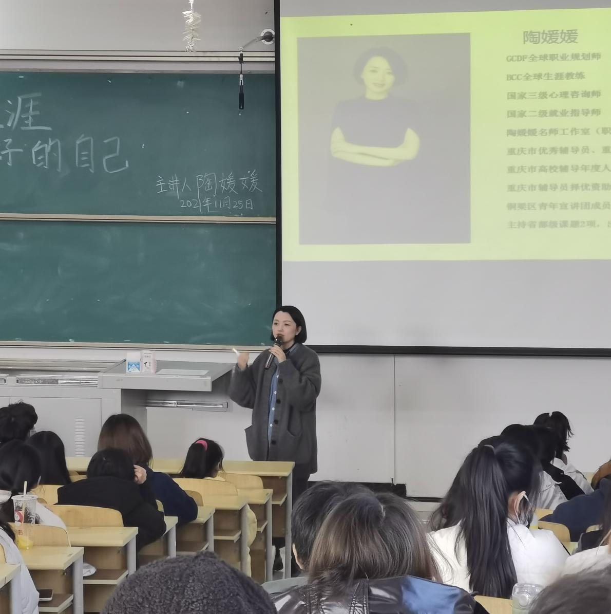 为推进优良学风、院风、校风建设,加强目标教育,帮助员工树立职业规划意识,从而引导其科学合理地规划学业、职业与人生。hy3380cc海洋之神于2021年11月25日下午15:00在铜梁校区T2508开展了主题为“唤醒生涯 遇见最好的自己”的职业生涯规划教育讲座。本次专题讲座邀请了GCDF全球职业规划师、BCC全球生涯教练名师陶媛媛担任主讲人,全院同学积极参加。